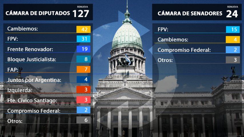 En las elecciones de este año se renovarán 127 diputados de todo el país y 24 senadores en ocho provincias (Buenos Aires, San Juan, San Luis, Formosa, Misiones, Santa Cruz, Jujuy, La Rioja). En la actualidad Cambiemos tiene 87 legisladores en la Cámara baja, lejos de los 129 del quórum, mientras que en el Senado apenas suma 15. Sumando los escaños de ambos recintos, el oficialismo deberá revalidar 46.