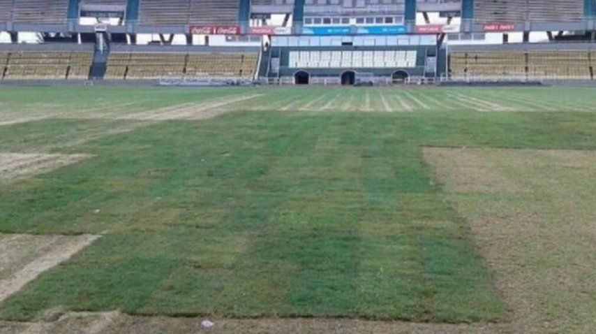 El campo de juego todavía tiene sectores castigados pese al intenso trabajo de los especialistas que envió la Asociación del Fútbol Argentino (AFA), especialmente la parte central en la que se observa la ausencia del color verde que sí tienen otros sectores.
