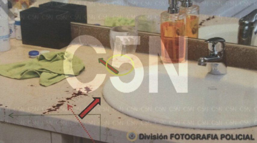 Si se hubiera disparado estando él frente a la bacha, afirman los peritos de Arroyo Salgado, las manchas de sangre debieran estar del lado derecho de la bacha, y no del izquierdo como se ve en la imagen.