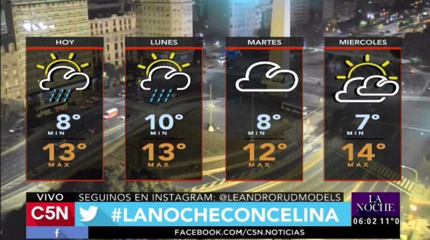 El Servicio Meteorológico Nacional pronostica para este domingo 26 de junio neblinas matinales, cielo nublado, baja probabilidad de lluvias aisladas y vientos moderados a regulares del sudeste, con ráfagas por la mañana. Cielo nublado, probabilidad de lluvias y chaparrones y vientos moderados del sudeste con algunas ráfagas por la tarde y noche mientras se dispute el partido entre Argentina y Chile por la Copa América Centenario. La temperatura oscilará entre los 8 y los 13 grados.