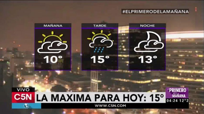 El Servicio Meteorológico Nacional (SMN) informó que la jornada de hoy en la Ciudad de Buenos Aires y alrededores se presenta con cielo parcialmente nublado a nublado, tiempo desmejorando con probabilidad de lluvias aisladas, vientos leves del sector este, rotando al sector sur y una temperatura que variará entre los 10 y 15 grados.
