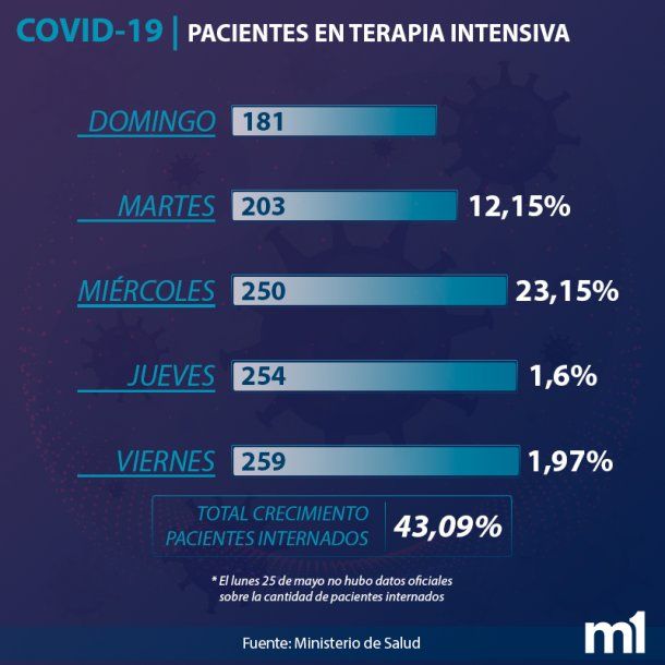 Entre los días domingo y martes –el lunes 25 de mayo no hubo datos oficiales sobre la cantidad de personas internadas – la cifra creció de 181 a 203, por lo que el aumento fue del 12,15%.