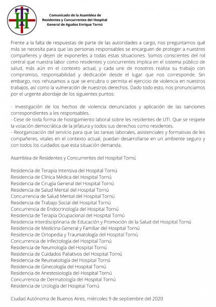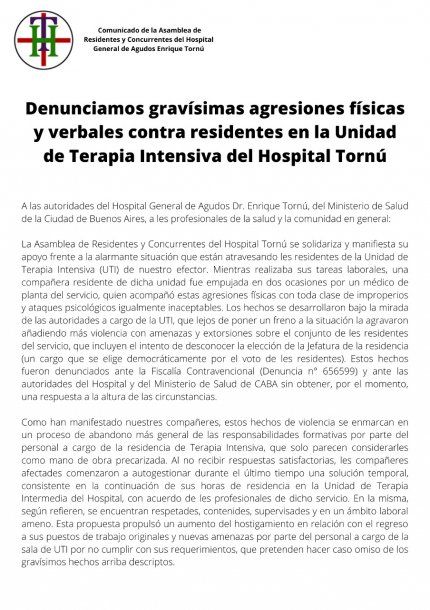 La Asamblea de Residentes y Concurrentes de Hospital Tornú denunció maltratos físicos y verbales hacia los trabajadores de la Unidad de Terapia Intensiva, en medio de la crisis social y de salud que atraviesa el país por la pandemia de coronavirus.