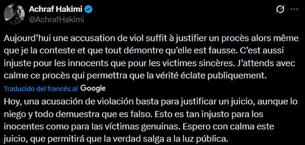 Tras hacerse pública la investigación, Hakimi utilizó sus redes sociales para fijar postura: “Hoy, una acusación de violación basta para justificar un juicio, aunque lo niego y todo demuestra que es falso. Esto es tan injusto para los inocentes como para las víctimas genuinas. Espero con calma este juicio, que permitirá que la verdad salga a la luz pública”.