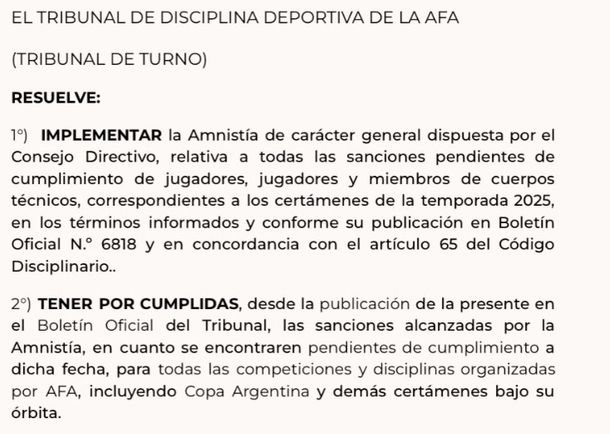 En ese mismo marco, la amnistía también alcanzó a Adrián Maravilla Martínez, quien quedó oficialmente habilitado para disputar la Copa Argentina. El delantero recibió el perdón de la sanción pendiente y podrá estar disponible en marzo para el cruce frente a San Martín de Formosa, una confirmación que se suma a la resolución general del Tribunal de Disciplina y que despeja cualquier duda sobre su situación reglamentaria en la competencia federal.