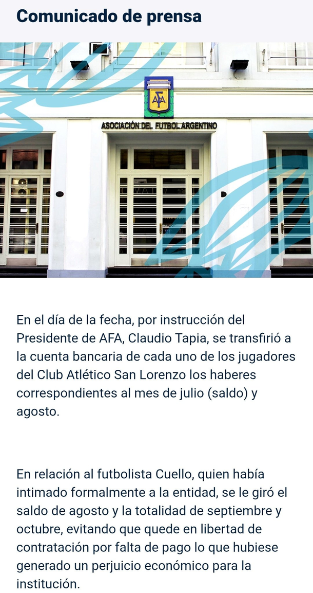 Bajo instrucción directa del presidente Claudio Tapia, la AFA “transfirió a la cuenta bancaria de cada uno de los jugadores del Club Atlético San Lorenzo los haberes correspondientes al mes de julio (saldo) y agosto”.