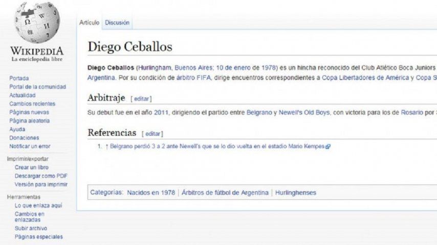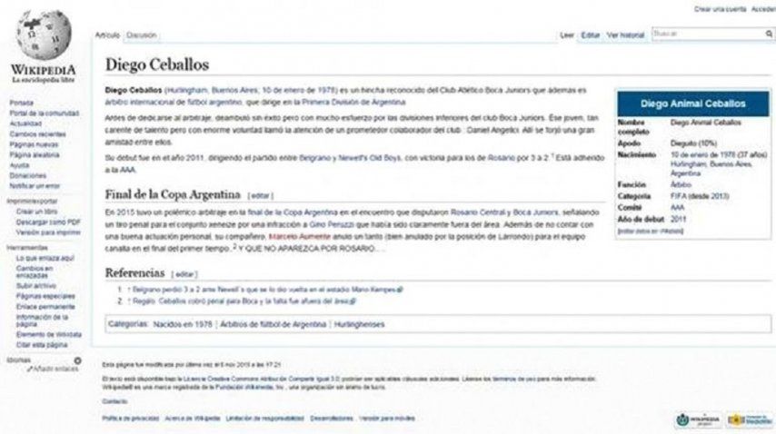 Tras su polémica actuación en la final de la Copa Argentina entre Boca y Rosario Central, usuarios anónimos modificicaron la biografía del árbitro en la conocida enciclopedia. El cambio duró algunos minutos.