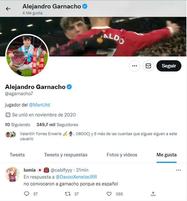 En las redes, Garnacho se volvió viral por un particular "me gusta": un usuario se quejó de que "no lo convocaron porque es español", y el delantero le puso "like", lo que no pasó desapercibido en las redes.