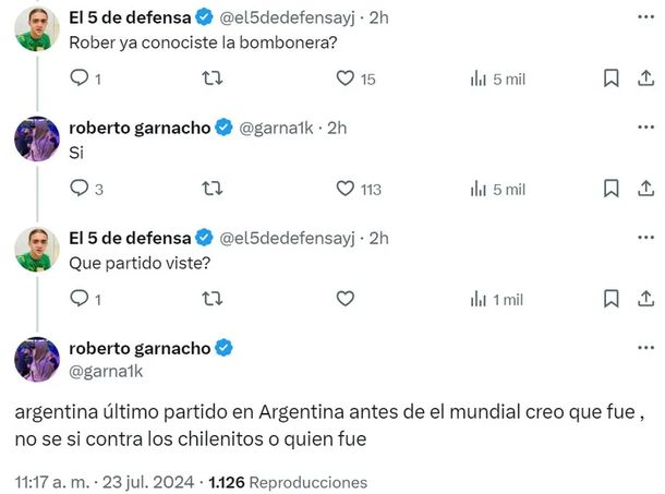 Un usuario le preguntó si conocía la Bombonera, a lo que el hermano de Alejandro Garnacho aseguró que por Eliminatorias 2022, último partido en Argentina antes del Mundial Qatar 2022. “Creo que fue, no sé si contra los chilenitos o quién fue”, respondió haciendo referencia al encuentro que la Selección se impuso por 3 a 0 a Venezuela, por la penúltima fecha, con goles de Nicolás González, Ángel Di María y Lionel Messi.