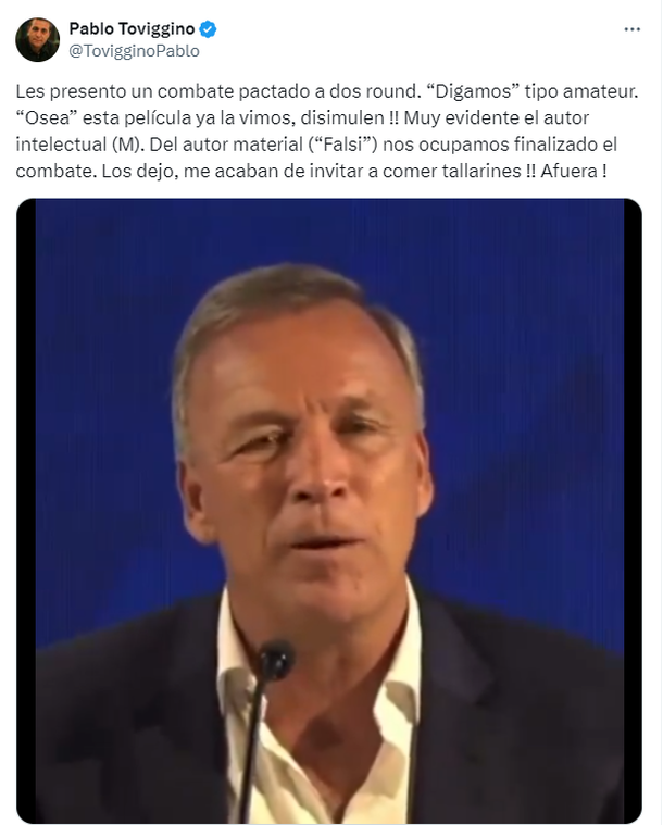 Pablo Toviggino, tesorero de la AFA, se pronunció públicamente en un comunicado en el que arremetió contra Fassi, cuestionando la legitimidad de sus argumentos y comparando su estilo de discurso con el del actual presidente de la Nación, Javier Milei. En el mismo utilizó un tono irónico y provocador al referirse a la situación: "Les presento un combate pactado a dos round. 'Digamos' tipo amateur. 'O sea' esta película ya la vimos, disimulen !! Muy evidente el autor intelectual (M). Del autor material ('Falsi') nos ocupamos finalizado el combate. Los dejo, me acaban de invitar a comer tallarines !! Afuera !".