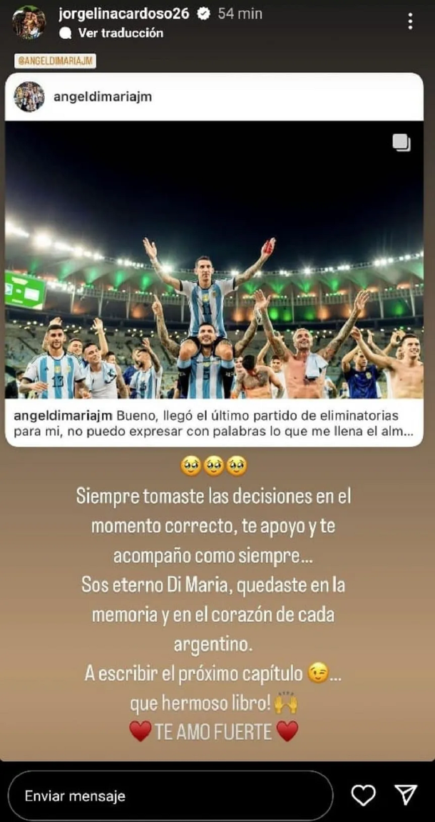 "Siempre tomaste las decisiones en el momento correcto, te apoyo y te acompaño como siempre... Sos eterno Di María, quedaste en la memoria y en el corazón de cada argentino. A escribir el próximo capítulo... Qué hermoso libro! Te amo fuerte", dice el posteo de Jorgelina en la red social Instagram.