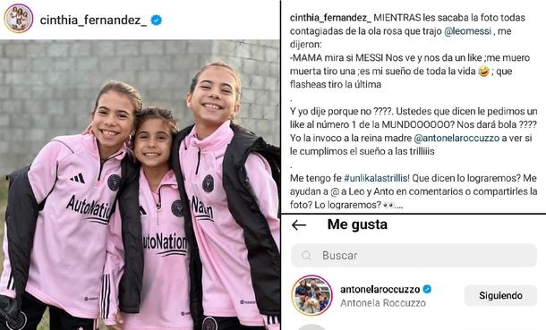 La pareja del '10' se hizo eco del pedido de Cinthia Fernández y fue ella quien le puso “me gusta” a la publicación. Solo resta esperar el ansiado “like” de Leo Messi que es con el que sueñan las hijas de Cinthia Fernández. Pero el gesto de Antonela Roccuzzo es un gran paso hacia el objetivo final.