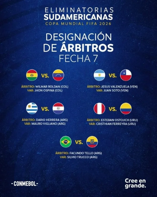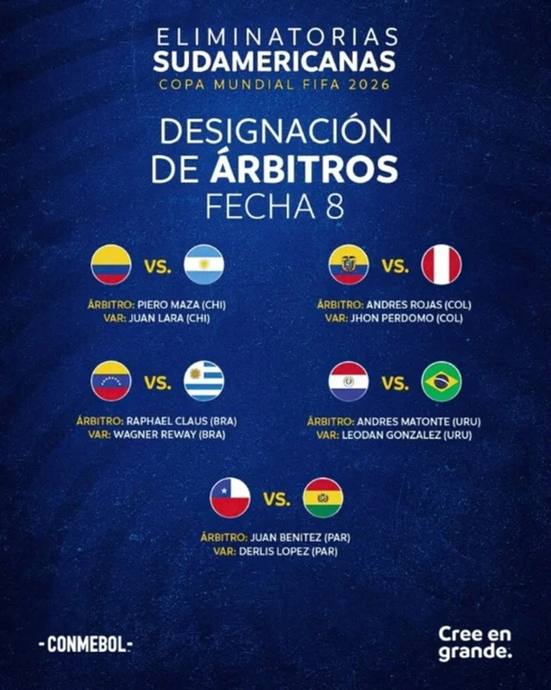En cuanto al siguiente compromiso de Argentina, el martes 10 de septiembre, el partido contra Colombia en Barranquilla será dirigido por el chileno Piero Maza, con Juan Lara a cargo del VAR.