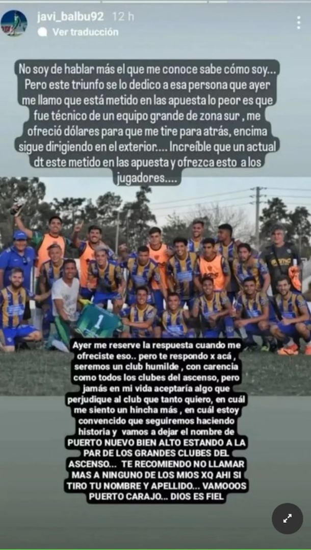 "Este triunfo se lo dedico a esa persona, que ayer me llamó, que está metido en las apuestas. Lo peor es que fue técnico de un equipo grande de zona Sur. Me ofreció dólares para que me tire para atrás, encima sigue dirigiendo en el exterior. Increíble que un actual DT esté metido en las apuestas y ofrezca esto a los jugadores", escribió junto a una foto del equipo festejando el triunfo.