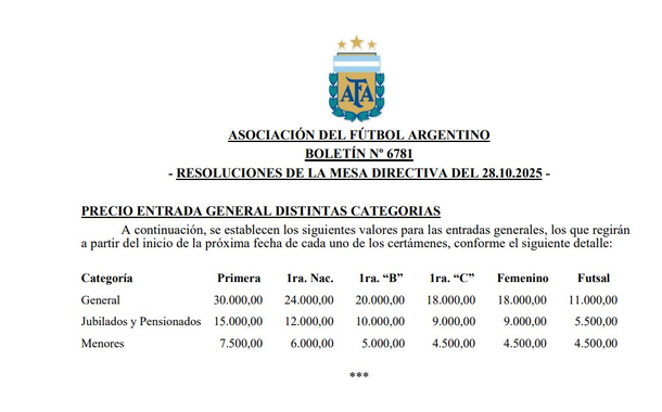 En el marco de su Asamblea General Ordinaria y Extraordinaria, la Asociación del Fútbol Argentino (AFA) dio a conocer una actualización de precios que impactará en todas las categorías del fútbol local. Las entradas generales aumentarán entre un 25% y un 35%, dependiendo de la división, y el nuevo esquema entrará en vigencia este mismo fin de semana.