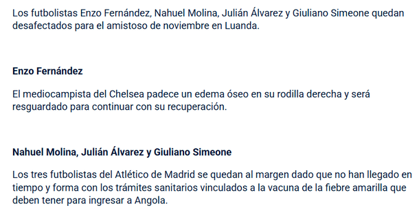 A las bajas de los tres futbolistas del Atlético se suma la de Enzo Fernández, quien fue desafectado previamente por un edema óseo en la rodilla. El volante del Chelsea no viajó a España y continuará con su recuperación bajo la supervisión del cuerpo médico del club inglés. Así, Scaloni contará finalmente con 22 futbolistas disponibles para el último compromiso del año, correspondiente a la fecha FIFA de noviembre.