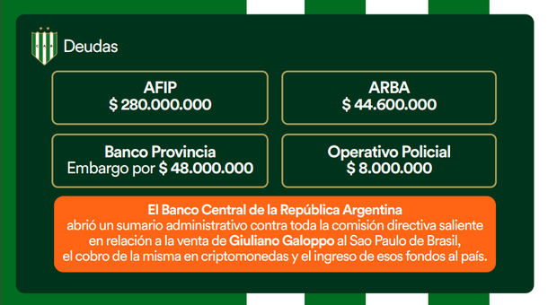 Tal y como documenta la CD, "el Banco Central de la República Argentina abrió un sumario administrativo contra toda la CD anterior en relación a la venta de Giuliano Galoppo al Sao Paulo, el cobro de la misma en criptomonedas y el ingreso de los fondos al país".