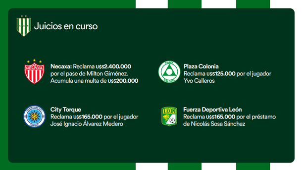 El estado de situación incluye cuatro juicios en curso con instituciones extranjeras (Necaxa, Plaza Colonia, City Torque y León), otros dos con futbolistas (Luis Enrique Mago y Renato Civelli), tres sentencias en FIFA por pagos pendientes por Erik López, Eric Remedi y al Insúa Group.