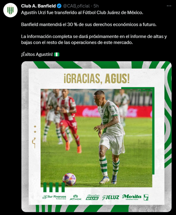 El delantero de Banfield Agustín Urzi es nuevo jugador de Bravos de Juárez, equipo de la primera división mexicana de fútbol y que dirige el argentino Rolando Cristante, confirmó el club argentino en sus redes sociales.