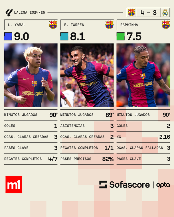 Los números de Lamine Yamal, Ferrán Torres y Raphinha en el triunfo de Barcelona ante Real Madrid