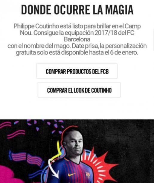 La empresa que viste a Barcelona, Nike, tuvo un desliz en su sitio web y publicó que el futbolista ya era nuevo jugador del club culé en su sitio web: "Philippe Coutinho está listo para brillar en el Camp Nou. Consigue la equipación 2017/18 del FC Barcelona con el nombre del 'mago'. Date prisa, la personalización gratuita solo está disponible hasta el 6 de enero".