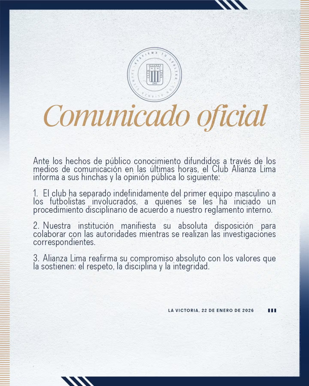 La institución no dudó en pronunciarse tras la acusación que envuelve a tres de sus futbolistas: "Ante los hechos de público conocimiento difundidos a través de los medios de comunicación en las últimas horas, el Club Alianza Lima informa a sus hinchas y la opinión pública lo siguiente: 1. El club ha separado indefinidamente del primer equipo masculino a los futbolistas involucrados, a quienes se les ha iniciado un procedimiento disciplinario de acuerdo a nuestro reglamento interno".