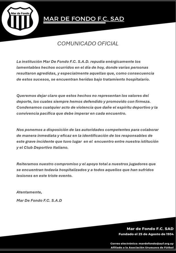 Tras el lamentable episodio, Mar de Fondo emitió un comunicado repudiando los hechos de violencia: “El club con origen en el barrio Palermo lamenta y repudia los hechos de violencia acontecidos, manifiesta su intención de colaborar con la identificación de los responsables y envía apoyo a nuestros jugadores que se encuentran todavía hospitalizados y a todos los que han sufrido lesiones en este triste evento”, expresaron en el comunicado.