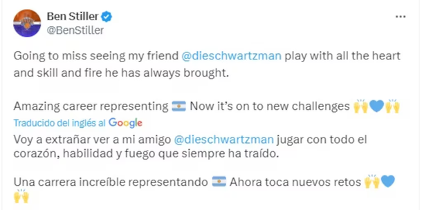 Entre los fanáticos que lo apoyaron, destacó la presencia del actor y director Ben Stiller, quien desde 2019 mantiene una estrecha amistad con Schwartzman. A través de su cuenta en la red social X, le dedicó un conmovedor mensaje: "Voy a extrañar ver a mi amigo Diego Schwartzman jugar con todo el corazón, habilidad y fuego que siempre ha traído. Una carrera increíble representando a Argentina. Ahora tocan nuevos retos".