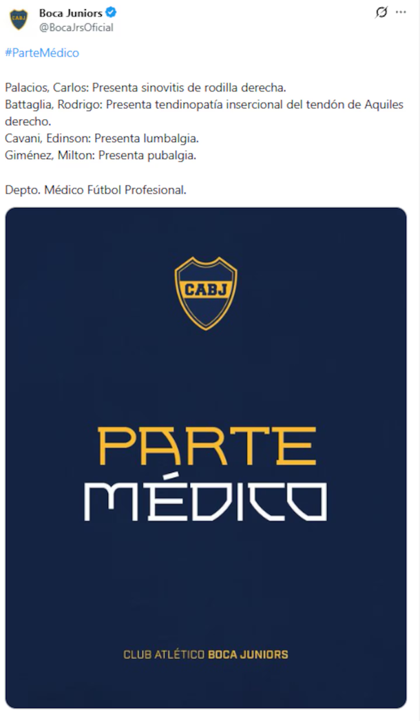 En el detalle clínico, Boca explicó que Cavani padece una lumbalgia que lo obligó a bajar las cargas de trabajo, Battaglia arrastra una tendinopatía insercional en el tendón de Aquiles derecho y Palacios presenta una sinovitis en la rodilla derecha. A ellos se suma Milton Giménez, afectado por una pubalgia, aunque su ausencia no modifica el análisis principal del equipo ya que no estaba proyectado como titular para este encuentro. La prioridad del cuerpo técnico es que todos lleguen en condiciones al inicio del Torneo Apertura 2026.