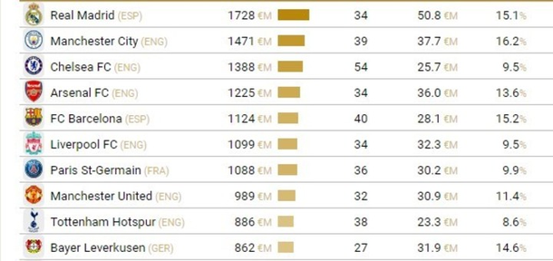 El listado, que es encabezado por el Real Madrid con un impresionante valor estimado de 1.728 millones de euros, también destaca la fortaleza económica de otros gigantes como el Manchester City, que ocupa el segundo lugar con 1.471 millones, y Chelsea, en el tercer puesto con 1.388 millones cerrando este poderoso podio.