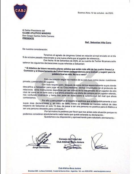 "Tenemos el agrado de dirigirnos Usted en relación al mail enviado en el día 9 de octubre pasado relacionado a una nueva oferta por el jugador de referencia. Con fecha 16 de setiembre de 2020, en su cuenta de Twitter @camara.sette salieron las siguientes declaraciones suyas referidas a Sebastian", comienza diciendo la carta, con notables errores ortográficos.
