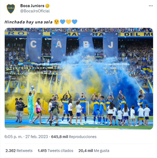 "Hinchada hay una sola", escribió el CM "xeneize" junto a un emoji de guiño y corazones azul y amarillo, generando revuelo.