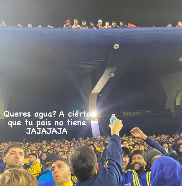 En la foto difundida, se puede ver a un hincha de Boca mostrándole una botella de agua a los fanáticos de Nacional. "¿Querés agua? A cierto que tu país no tiene", dice el texto que acompaña a la fotografía.