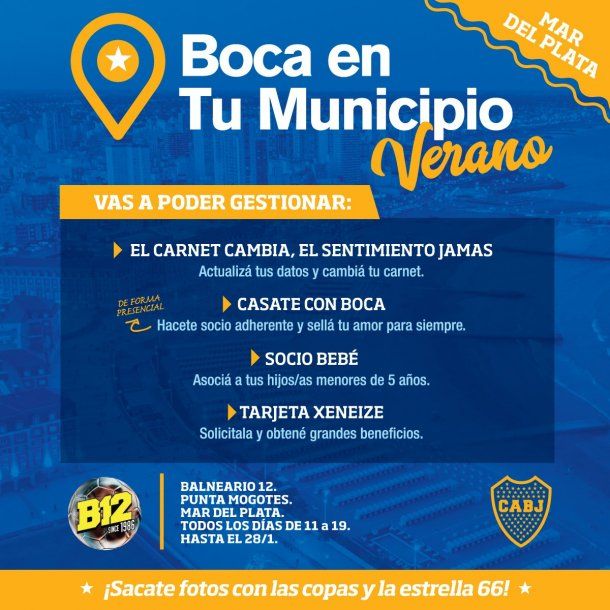 En el stand se podrán gestionar distintos trámites con el Centro de Atención al Socio, tomarse fotos con los trofeos, la estrella 66 y camisetas históricas del club. Al calor de la playa y con el ritmo de Punta Mogotes también se puede hacer un espacio para actualizar los datos y cambiar el carnet de socio, inscribirse como socio adherente y a un menor de 5 años o sacar la Tarjeta Xeneize con descuentos exclusivos.
