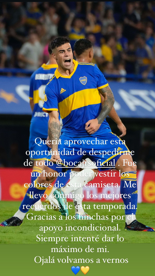 "Quería aprovechar esta oportunidad para despedirme de todo Boca. Fue un honor vestir esta camiseta. Me llevo conmigo los mejores recuerdos de esta temporada. Gracias a los hinchas por el apoyo incondicional. Siempre intenté dar lo máximo de mí. Ojalá volvamos a vernos", escribió el futbolista en Instagram.