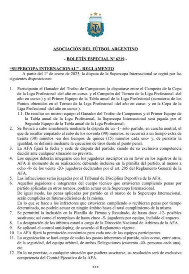 La Asociación del Fútbol Argentino (AFA) hizo oficial el reglamento de la "Supercopa Internacional" que jugarán Boca Juniors y Racing Club el viernes 20 de enero en Abu Dhabi, Emiratos Árabes Unidos, y se aclararon varias dudas.