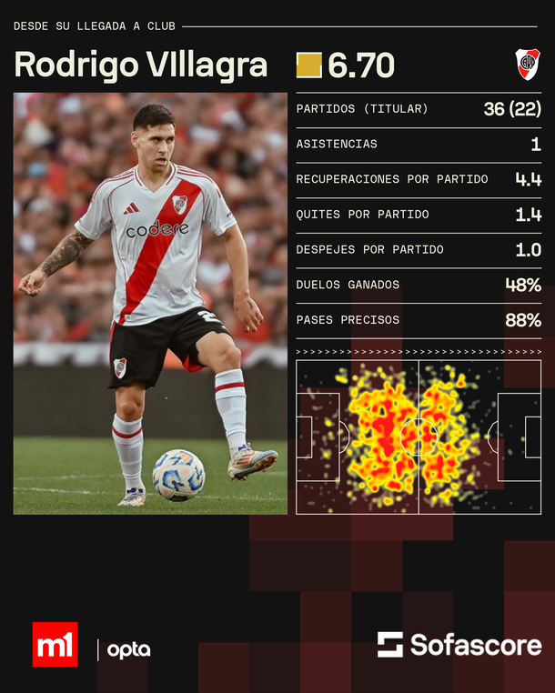 El mediocampista central Rodrigo Villagra disputó 36 partidos en el año que estuvo en River, de los cuales en 22 fue titular. Solo aportó una asistencia.