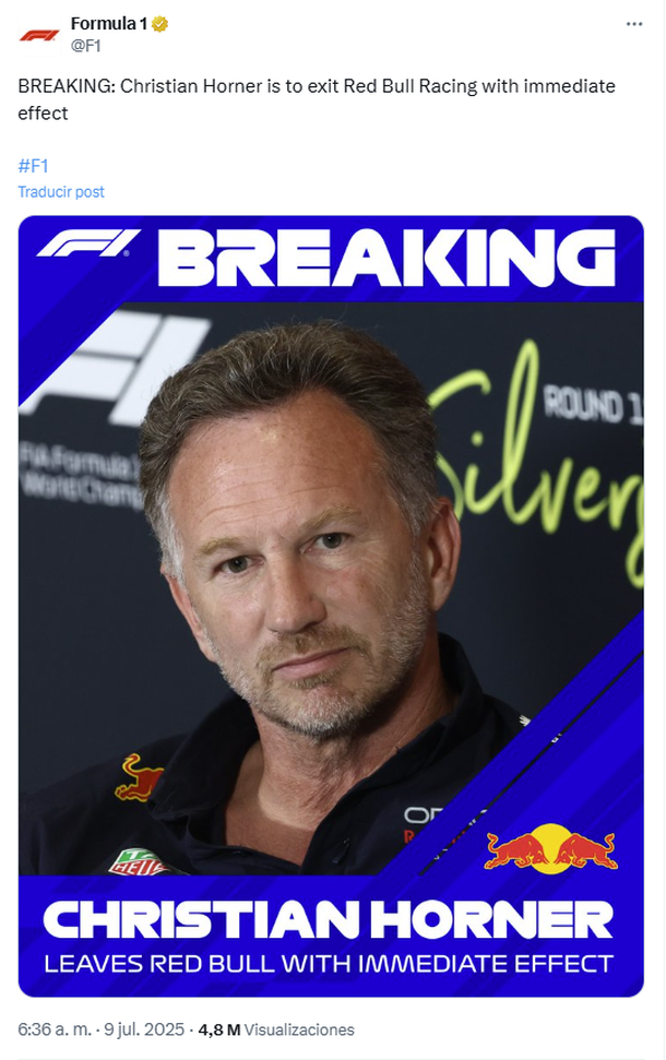 “Red Bull ha liberado a Christian Horner de sus funciones operativas a partir de hoy (miércoles 9 de julio de 2025) y ha nombrado a Laurent Mekies como CEO de Red Bull Racing”, dijo un portavoz de Red Bull.