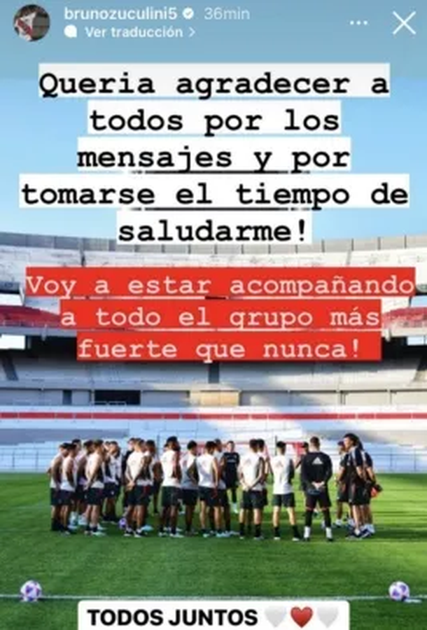 "¡Quería agradecer a todos por los mensajes y por tomarse el tiempo de saludarme! Voy a estar acompañando al grupo más fuerte que nunca", posteó Zuculini después de sufrir la lesión.