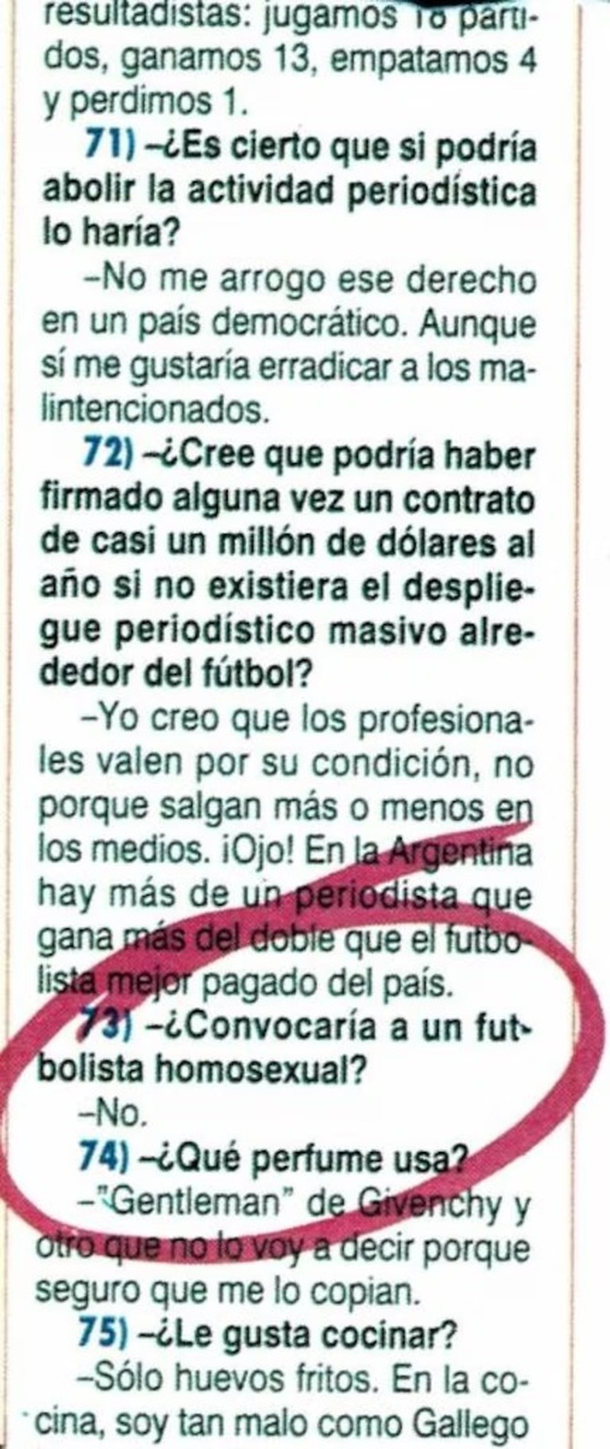 Uno de los casos más recordados es el de Daniel Passarella. Durante su etapa como entrenador de la Selección Argentina en la década de los 90, el "Káiser" fue consultado en una clásica entrevista de preguntas cortas si estaría dispuesto a convocar a un futbolista homosexual a su equipo. Su respuesta fue tajante, dolorosa y excluyente: "No".
