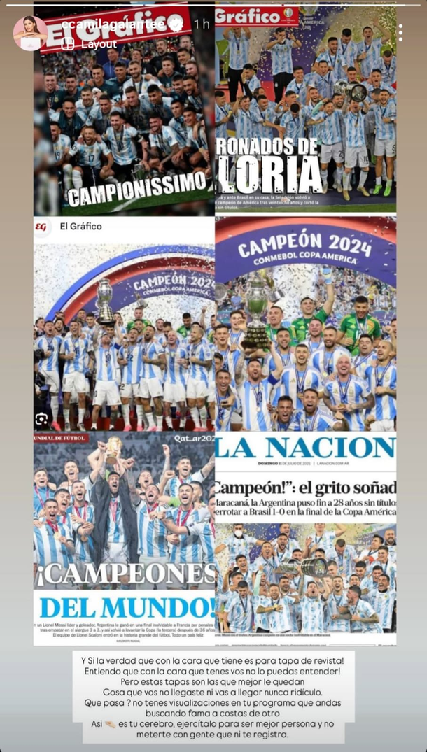La respuesta de Camila Galante no tardó en llegar y fue contundente, atacando directamente al aspecto físico y a la fama del comunicador. "Y Si la verdad que con la cara que tiene es para tapa de revista! Entiendo que con la cara que tenés vos no lo puedas entender! Pero estas tapas son las que mejor le quedan. Cosa que vos no llegaste ni vas a llegar nunca ridículo", sentenció.
