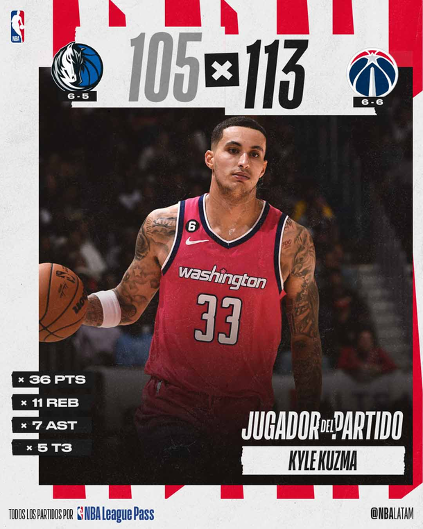 El goleador de Dallas fue el base Spencer Dinwiddie con 33 puntos, mientras que el máximo anotador del partido resultó el ala pivote de Washington, Kyle Kuzma, con 36 tantos.