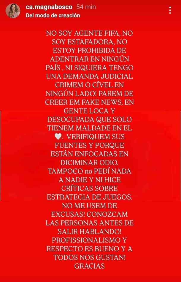Además, negó rotundamente cualquier vínculo con irregularidades: “No soy agente FIFA. No soy estafadora. No estoy prohibida de entrar en ningún país. Ni siquiera tengo una demanda judicial o civil en ningún lado. Paren de creer en Fake News”.