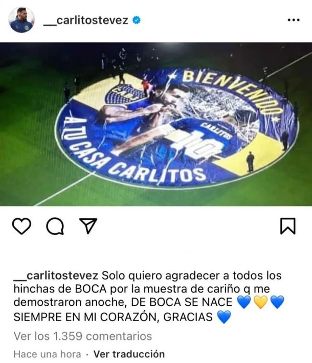 "Solo quiero agradecer a todos los hinchas de Boca por la muestra de cariño que me demostraron anoche; de Boca se nace", remarcó el "Apache" en su cuenta de Instagram.