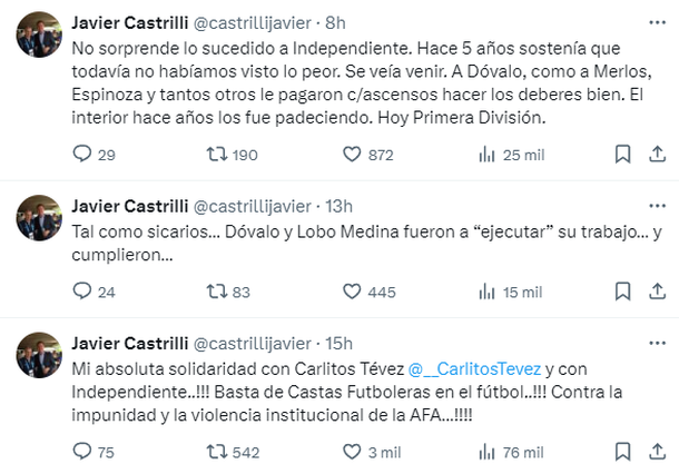 "Mi absoluta solidaridad con Carlitos Tévez y con Independiente..!!! Basta de Castas Futboleras en el fútbol..!!! Contra la impunidad y la violencia institucional de la AFA…!!!!", expresó el ex referí en su cuenta de Twitter. Y además agregó unos minutos después: “Tal como sicarios… Dóvalo y Lobo Medina fueron a ‘ejecutar’ su trabajo… y cumplieron…”.