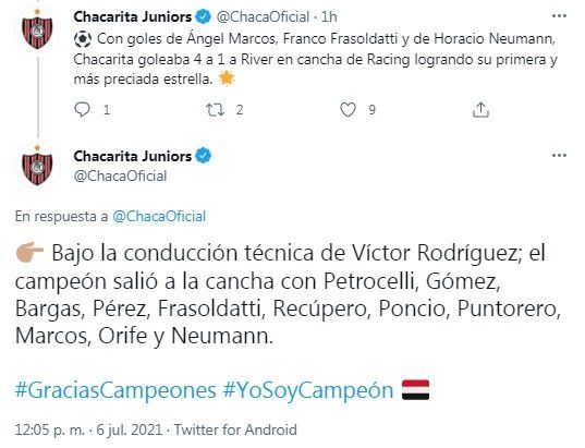 El texto publicado por el club "funebrero" recuerda que "un día como hoy de 1969 con los goles de Ángel Marcos, Franco Frassoldati y Horacio Neumann, Chacarita goleaba 4 a 1 a River en cancha de Racing, logrando su primera y más preciada estrella".