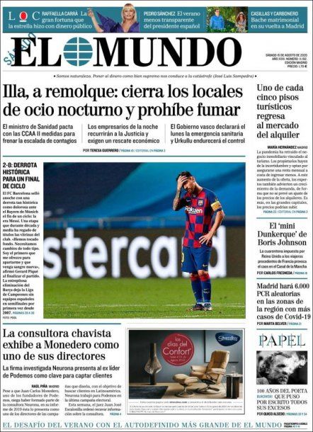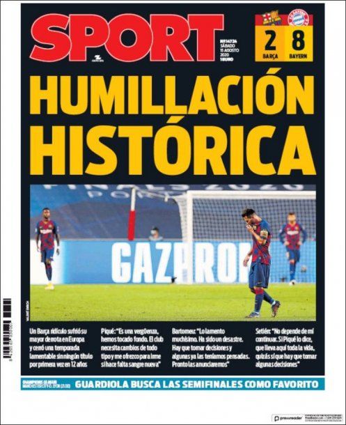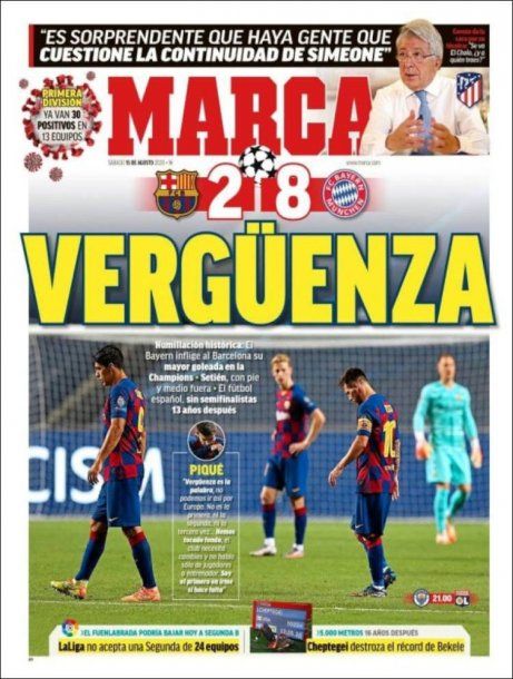 El 8-2 final fue motivo suficiente para que los distintos diarios de España saquen tapas con títulos impactantes haciendo referencia al insólito partido que se vio este viernes en Lisboa. La prensa española no se guardó nada y criticó a todos por igual. Se habló desde "fin de ciclo" hasta "vergüenza", entre otros.