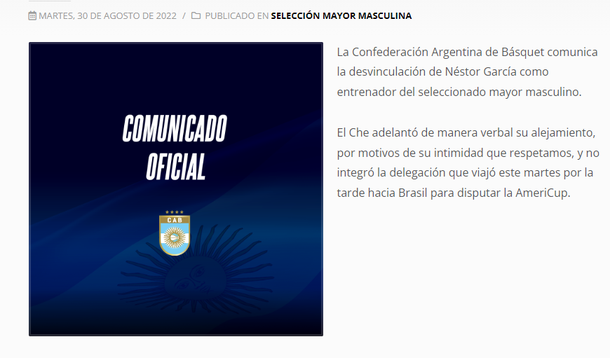 El comunicado oficial: "La Confederación Argentina de Básquet comunica la desvinculación de Néstor García como entrenador del seleccionado mayor masculino", comenzó. Y Además, agregó: "El Che adelantó de manera verbal su alejamiento por motivos de su intimidad que respetamos, y no integró la delegación que viajó este martes por la tarde hacia Brasil para disputar la Americup".