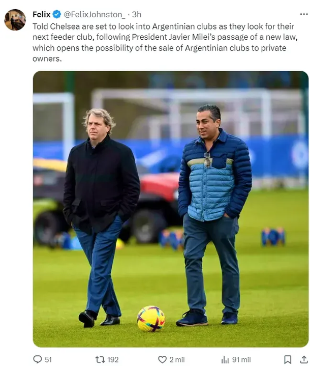 Felix Johnston, reconocido periodista británico que está muy metido en el día a día de los Blues, confirmó en sus redes sociales que el club “está listo” para investigar posibilidad de comprar un club de Argentina y sumarlo a su grupo. De la mano de Todd Boehly, dueño de la institución londinense, estudiarán las posibilidades para invertir en el país.