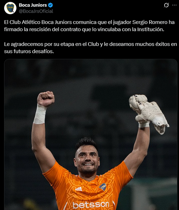 "El Club Atlético Boca Juniors comunica que el jugador Sergio Romero ha firmado la rescisión del contrato que lo vinculaba con la Institución. Le agradecemos por su etapa en el Club y le deseamos muchos éxitos en sus futuros desafíos."